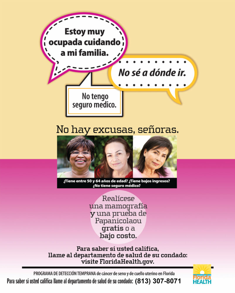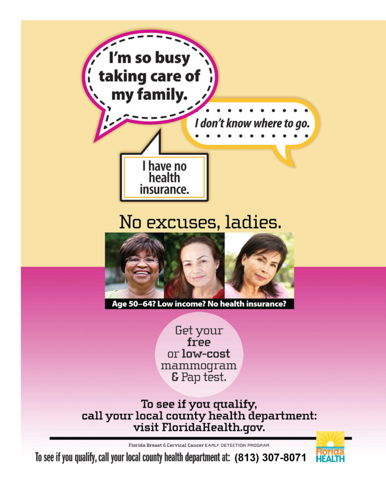 The Florida Breast and Cervical Cancer Early Detection Program makes it easy to have doctor-recommended breast and cervical cancer screenings like clinical breast examinations, mammograms, and pap smears for women who qualify for services. This national program emphasizes providing services for women who have not had a screening exam in 5 years or longer. The screenings are free or low cost if you meet program eligibility requirements.